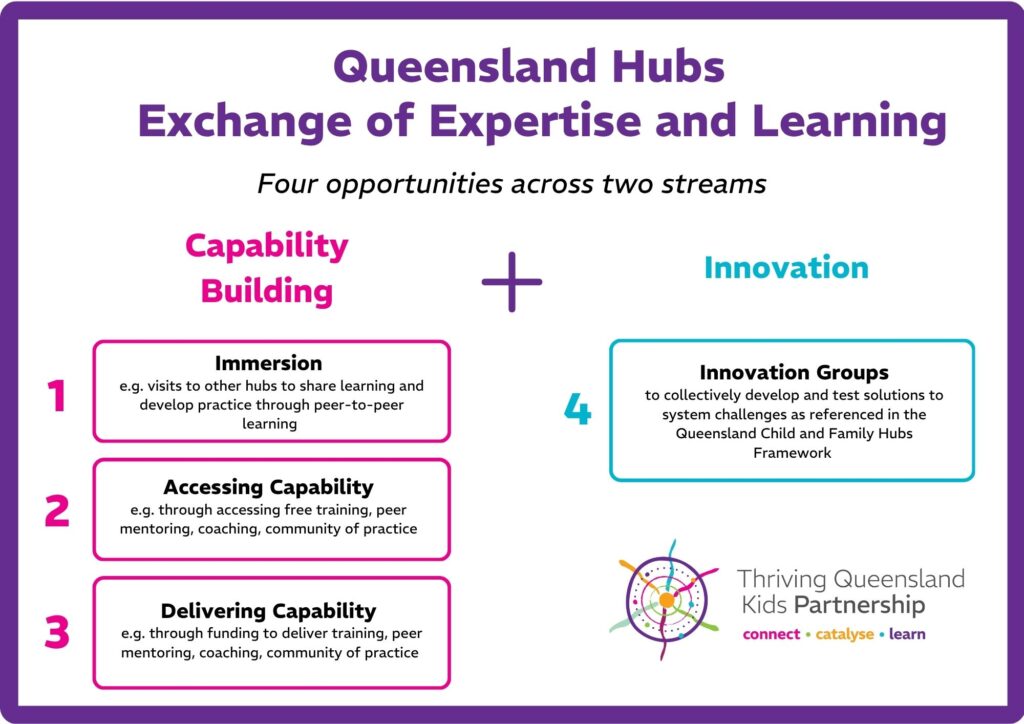 As this is a new initiative, we have prepared a comprehensive overview document explaining the new Queensland Exchange of Expertise and Learning initiative and how to apply for the four offerings designed to boost hubs and support Queensland children to thrive.