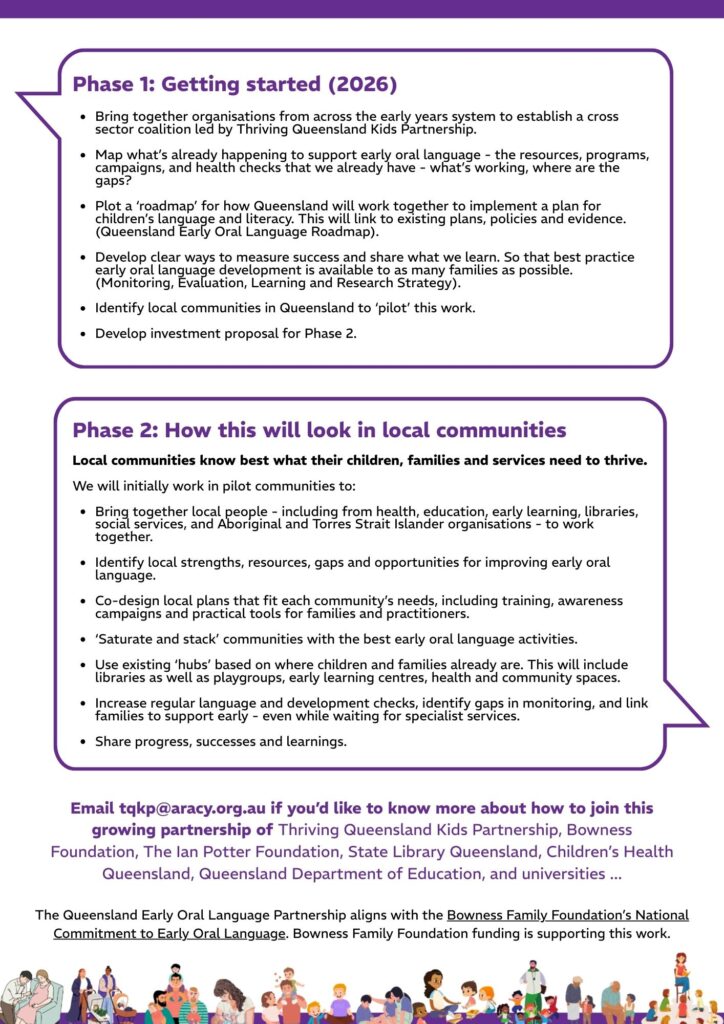 Plot a ‘roadmap’ for how Queensland will work together to implement a plan for children’s language and literacy. This will link to existing plans, policies and evidence. (Queensland Early Oral Language Roadmap).