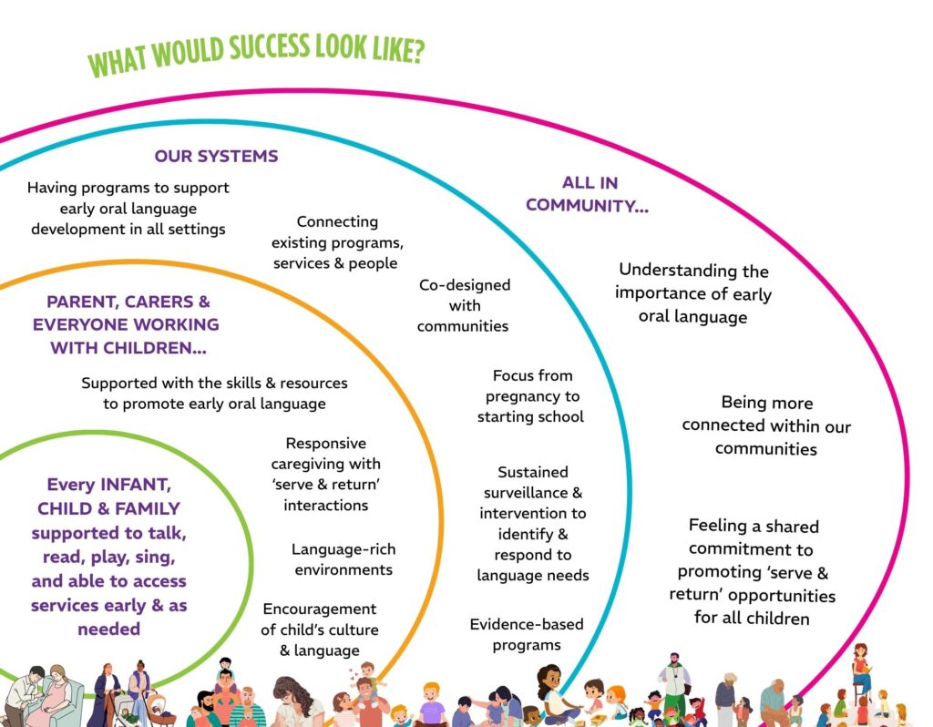 When communities support early oral language – from pregnancy to starting school – we all benefit: family relationships are strengthened, children arrive at school ready to connect and learn, and we lay the foundation for lifelong health and participation.